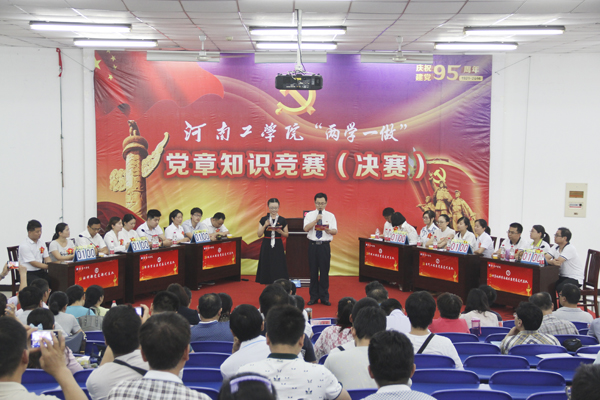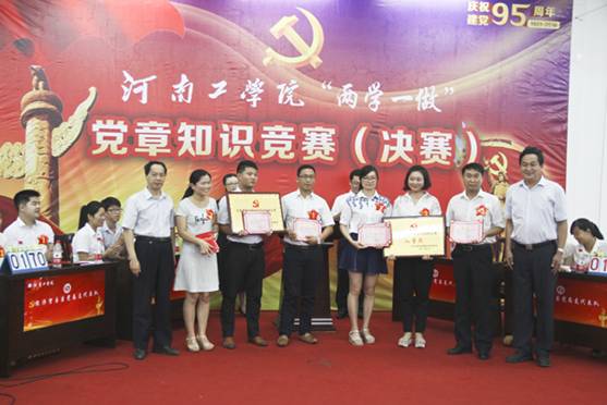 7月12日,由校“两学一做”领导小组办公室办公室举办、电气工程系党总支承办的庆祝建党95周年学习《中国共产党章程》知识竞赛在校公教楼A105举行。校领导赵学通、刘云兵、贾国强与全校教工党员代表和离退休党员代表观看了比赛。  比赛进行时 本次知识竞赛分初赛和决赛两个阶段,初赛采取闭卷考试形式进行。经过初赛,从全校17支代表队中选拔出来的6支代表队参加了决赛。整场比赛紧张有序、精彩纷呈,参赛选手沉着冷静、机敏睿智,现场观众热情高涨、踊跃参与。经过必答题、抢答题、风险题和附加题等四个环节的激烈角逐,机电工程系党总支代表队脱颖而出,摘取桂冠;社会科学部党支部代表队、管理工程系党总支代表队荣获团体二等奖;计算机科学与技术系党总支代表队、经济贸易系党总支代表队、电气工程系党总支代表队荣获团体三等奖。  颁奖留念(一)  颁奖留念(二) 校领导赵学通对比赛进行了点评,并作了重要讲话。他指出,这次学习党章知识竞赛是我校“两学一做”学习教育的一项重要内容,也是庆祝建党95周年系列纪念活动之一,其主要目的是激发全校党员学习党章的热情,教育引导全校党员全面理解党章、尊崇遵守党章、自觉维护党章,不断增强党员意识,提升政治意识、大局意识、核心意识和看齐意识,争当合格党员。 |