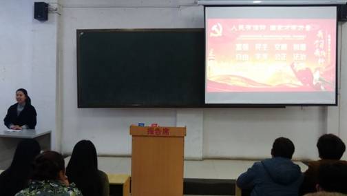 为进一步深化大学生对社会主义核心价值观的认识,引导大学生树立正确的道德观和价值观,艺术系于2016年11月22日晚在公教楼B101举行了以“弘扬社会主义价值观”为主题的文化讲堂活动。艺术系辅导员芦艺、侯安娴以及2016的全体学生出席本次主题教育活动。