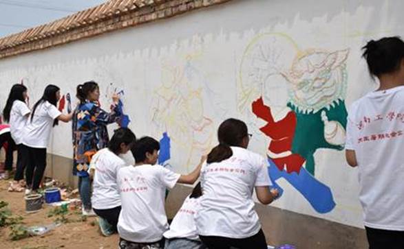 一大早,志愿服务队各项公益活动在祝店村委大院热火朝天地展开。在家电维修区,早早地就摆满了群众送修的电风扇、电磁炉、电视机、洗衣机等各种电器,电子系副主任李福勤,组织部副部长李伟峰带领电子系的学生志愿者们将电器分类,仔细检查所出故障,分析问题所在,“对症下药”,用自己过硬的专业技术给每一件送修电器“把脉”,当志愿者将一件件维修好的电器交还到村民手中时,赢得了他们的一致好评。文化墙旁,艺术系的师生顶着炎炎烈日挥洒笔墨,精心构图,认真创作,设计创作了20多幅村民喜闻乐见的墙绘作品,不仅美化了村容村貌,也增添了人文气息,绘“活”了农村文化,推动了农村精神文明建设。傍晚,校团委组织的大学生艺术团的志愿者们,给村民们带来了一场精彩的文艺演出,师生们表演的歌舞、说唱、小品等与村腰鼓队精彩纷呈的表演,赢得了村民们的阵阵喝彩,带给了广大村民一场视觉盛宴,把志愿帮扶活动现场的气氛推向了高潮。