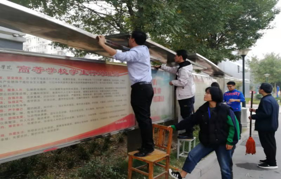 二、11月4日下午,学生处在校文明办指出问题以后立行立改,处长朱松梅、副处长于善思带领学生一起清理宣传栏。