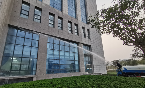 三、图书馆对检查中发现的问题,协调后勤管理处出动洒水车清理图书馆外部玻璃幕墙。