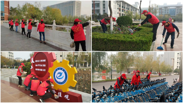 四、11月4日下午,教务处、科研处、教评中心24名教师身穿红马甲在校园内开展志愿服务,擦拭宣传牌、清理环境卫生、摆放单车,积极参与文明校园创建,为学生做出榜样。