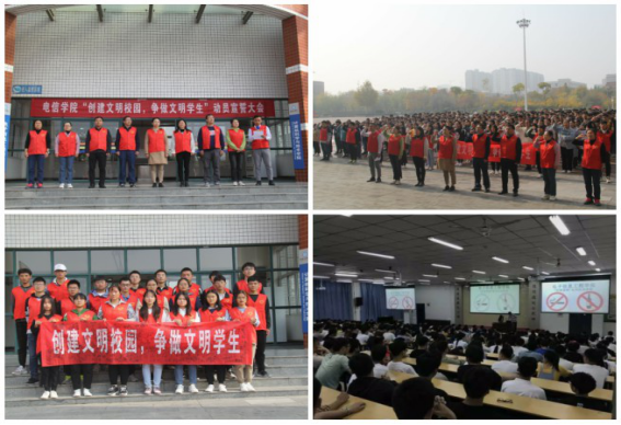 五、11月5日下午,电信学院在人文广场举办了“创建文明校园,争做文明学生”的动员大会,学生代表马元麟宣读《倡议书》,孙博老师带领全体参会人员进行宣誓并在条幅上进行签字。会后邀请了校医院许医生给师生讲解了烟酒带来的危害。