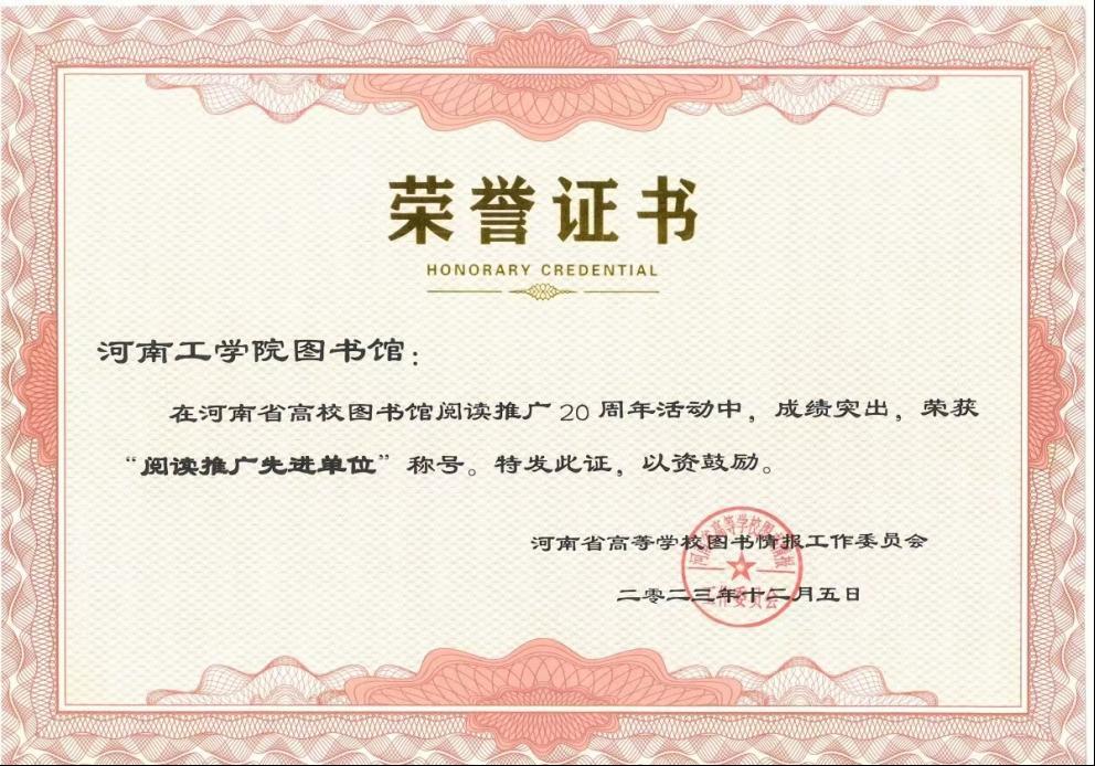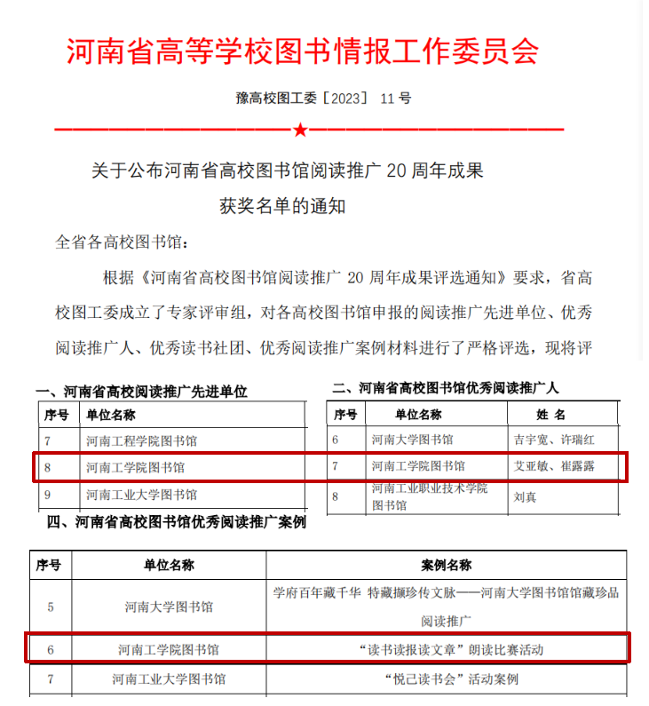 近日,河南省高校图书馆阅读推广20周年成果评选表彰大会在郑州召开,我校图书馆获“河南省高校阅读推广先进单位”,两位老师获评“河南省高校图书馆优秀阅读推广人”,《“读书读报读文章”朗读比赛活动》获“河南省高校图书馆优秀阅读推广案例”。