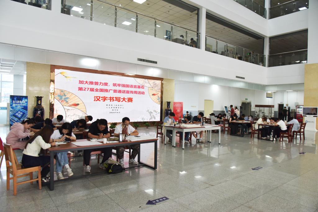 为进一步弘扬爱国主义精神和中华优秀传统文化,增强文化自信,激发师生“说普通话,写规范字”的主体意识,营造推广普通话的良好氛围,9月19日,学校于图书馆一楼大厅举办第27届全国推广普通话宣传周汉字书写大赛,此次活动由教务处(语委办)、人文素质教育中心、图书馆共同举办。