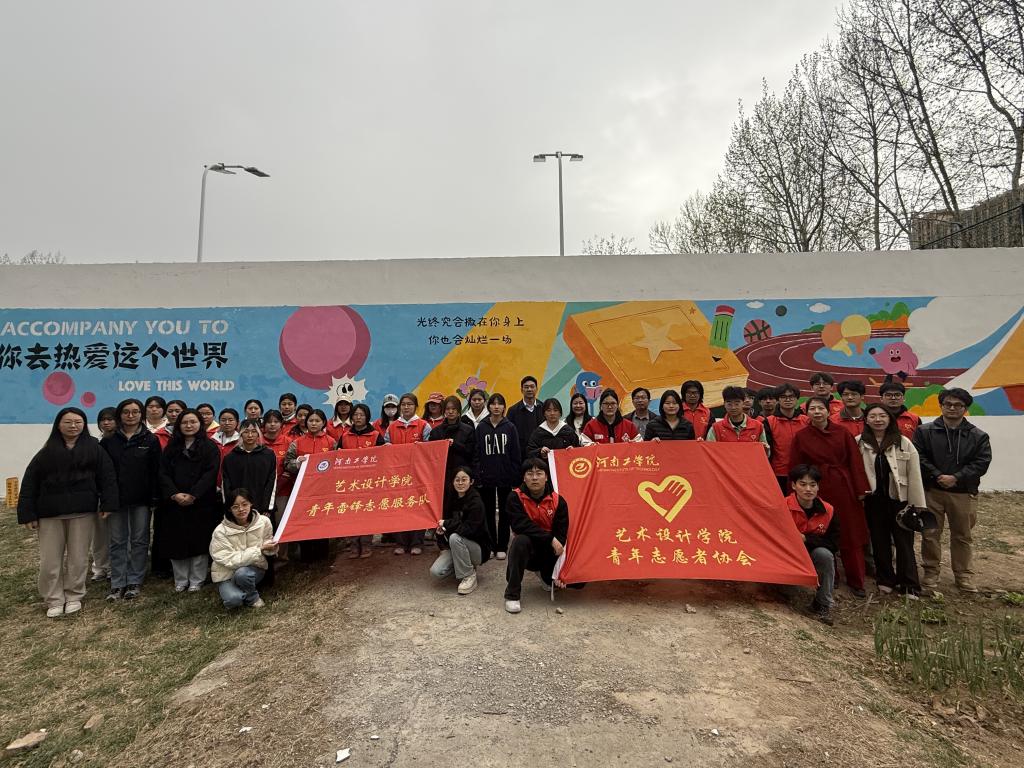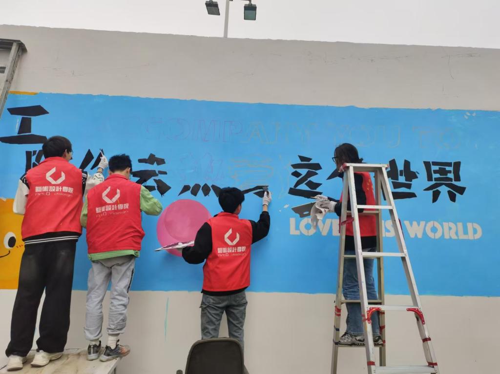 清晨七点的校园还笼罩着薄雾,文化墙前已摆满了颜料桶和脚手架。师生志愿者们身着红色马甲,在初春的寒风中挥毫泼墨。学生们在专业教师指导下反复推敲构图,将传统壁画技法与现代喷绘工艺相结合,使整幅作品既保留手绘的温度,又充满时代气息。师生们在脚手架上攀爬作业,既要克服空中作业的心理压力,又要解决墙面肌理导致的色彩偏差,这种将专业技能与社会责任相结合的教学模式,让学生在具象化的艺术表达中深化了对雷锋精神的理解,使志愿服务从简单的劳动输出升华为创造性的价值实现。