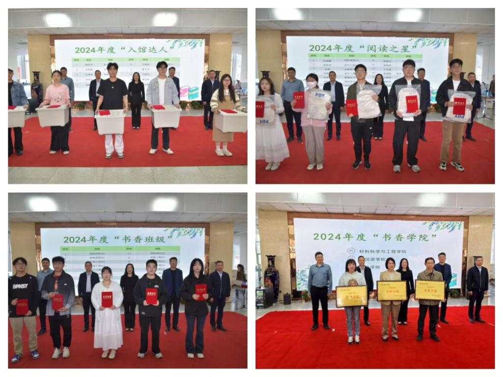 活动现场对2024年度阅读推广先进集体与个人进行表彰。 与会领导为荣获“书香学院”“书香班级”“阅读之星”“入馆达人” 称号的集体和个人颁发奖项。获奖学生代表卢看看分享了自己在图书馆学习获得的成长与感悟,表达了阅读赋予自己的心灵滋养和成长蜕变。