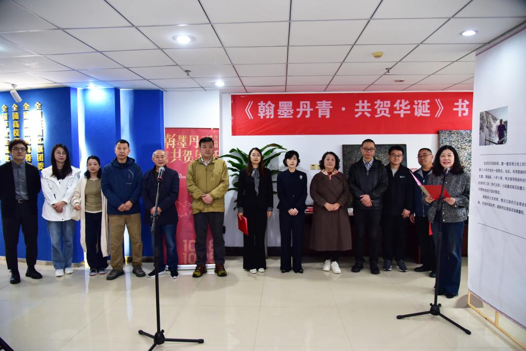 梁静宣布“翰墨丹青・共贺华诞”书画作品展开幕。她在讲话中强调,大学的发展离不开文化滋养。此次书画展作为校庆重要文化活动之一,既展现了学校艺术教育成果与教师风采,也为师生搭建了文化交流平台。她希望艺术设计学院持续深耕美育工作,广大师生从作品中汲取精神力量。