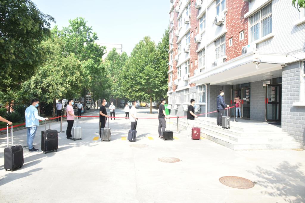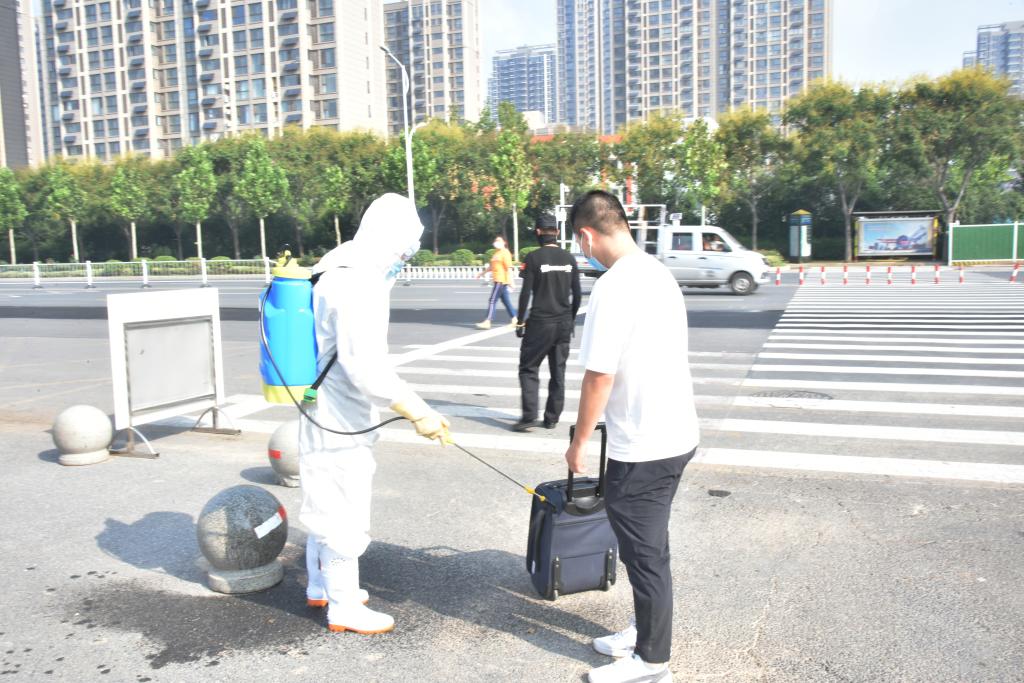 在模拟师生返校报到场景中,学生到达学校北门后,在现场安保人员引导下有序进入校园,消毒工作人员负责对学生双手、行李、物品进行全面消毒。学生按照1.5米间距的地贴位置有序排队,健康检测工作人员查验学生健康码、行程码、开学前连续14天打卡轨迹,体温正常、核验成功的人员方可进入校园。