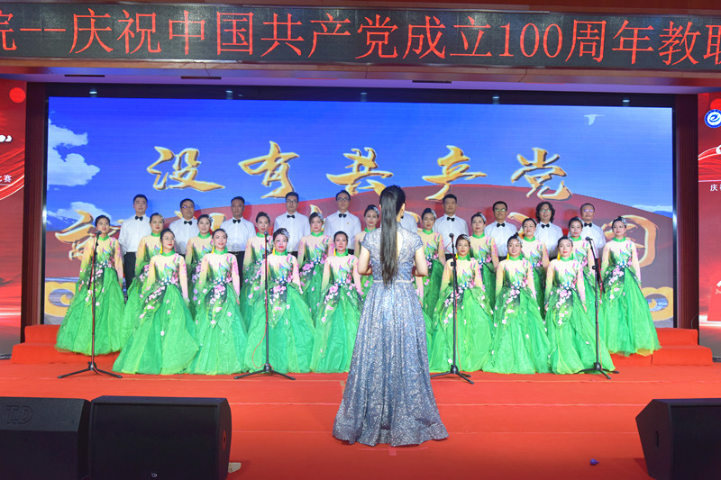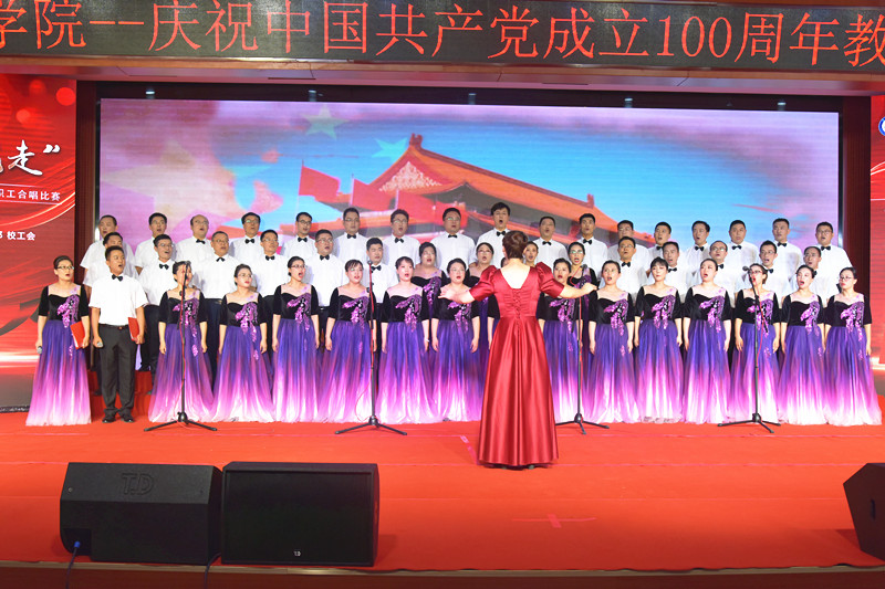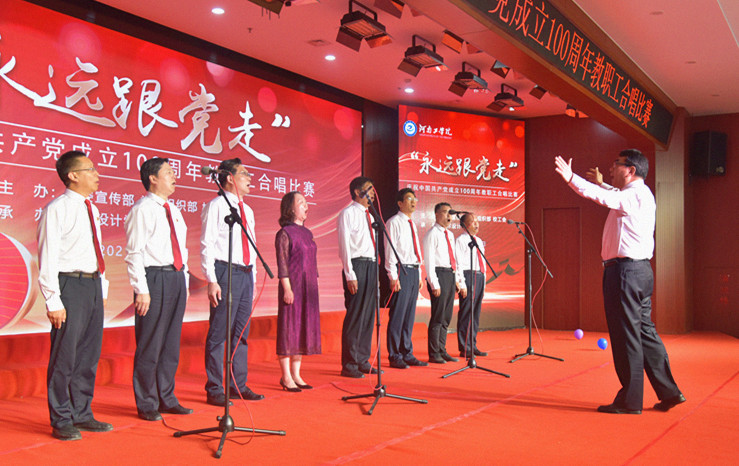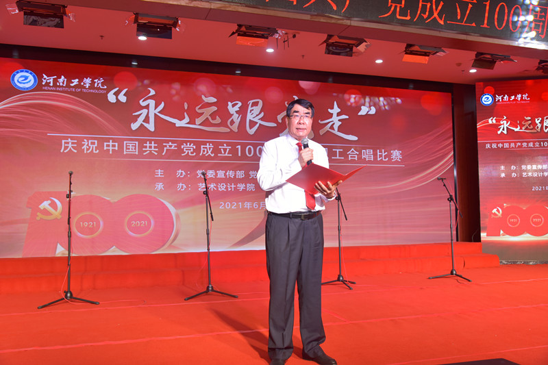 党委书记赵学通致辞,他指出,在党史学习教育不断走向深入之际,我们用嘹亮的歌声,共同庆祝党的百年华诞,这是全校开展党史学习教育的生动一课。100年来,无数党的儿女唱响革命之歌、建设之歌、改革之歌,创造了一个个不朽奇迹,完成了一次次伟大蜕变。传唱红歌,进一步缅怀革命先辈的丰功伟绩,铭记红色历史,继承革命传统,旨在赓续红色血脉,汲取奋进力量,坚定不移听党话、跟党走。他号召教职工要唱响共产党好、伟大祖国好的时代主旋律,唱出奋斗者姿态,展现中国共产党人蓬勃的朝气,昂扬的锐气,浩然的正气;唱出磅礴力量,展示河南工学院人积极向上的精神风貌和“开拓进取、自强不息”的学校精神;唱出精气神,把对党的热爱,对理想的追求融入到美妙的歌声中,唱响为党育人、为国育才的初心使命,落实好立德树人根本任务,以更加优异的成绩向党的百年华诞献礼!
