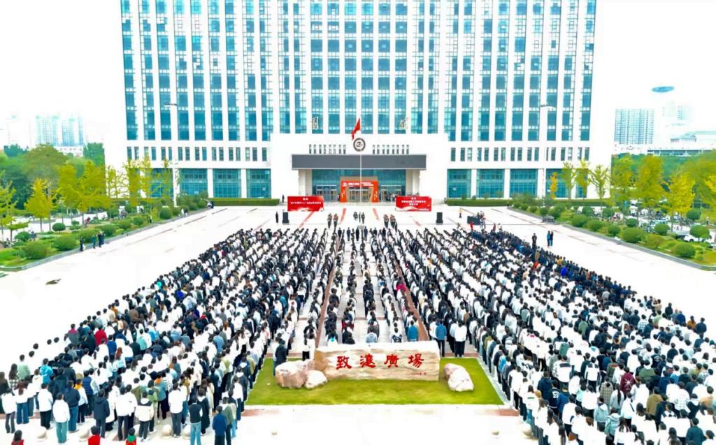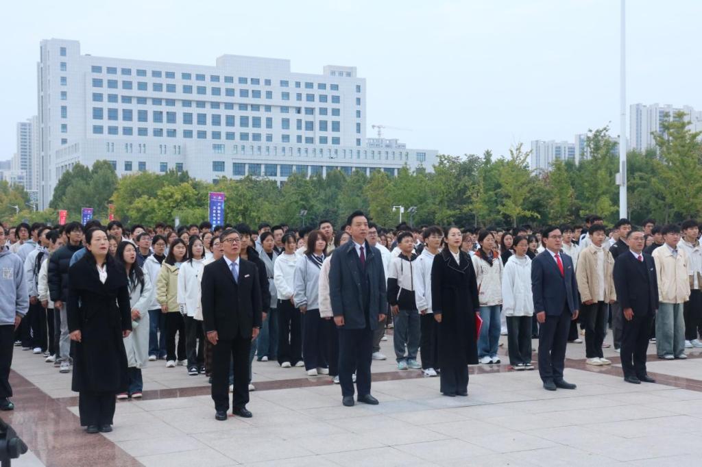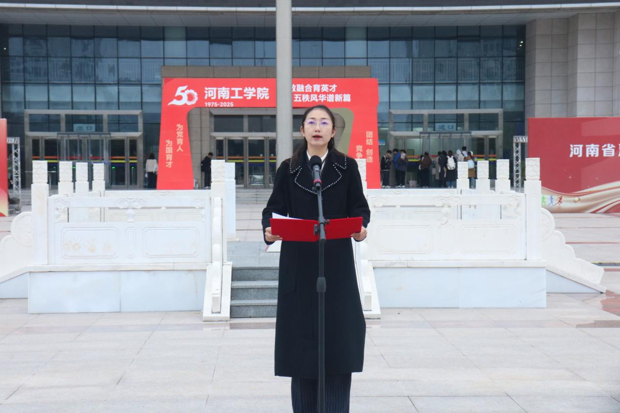 升旗仪式后,校党委副书记、副校长梁静发表致辞。她深情回顾了学校50年来的发展征程,从1975年工学结合中诞生的工人大学,到如今跻身河南省示范性应用技术类型本科高校行列,“河工人”用实干实现了三次关键性跨越,铸就了今日的荣光。立足五十年历史节点,梁书记指出,当前学校正踏上获批硕士学位授予单位的新征程,我们将以习近平新时代中国特色社会主义思想为指导,深入贯彻落实习近平总书记关于教育的重要论述,对接教育强国战略,大力实施“三大战略”,统筹推进“六大工程”,确保2032年获批硕士学位授予单位,实现几代河工人的梦想和追求,推动学校呈现出综合实力更强、发展质量更高的新形象,为建设特色鲜明的高水平应用型大学而不懈奋斗。
