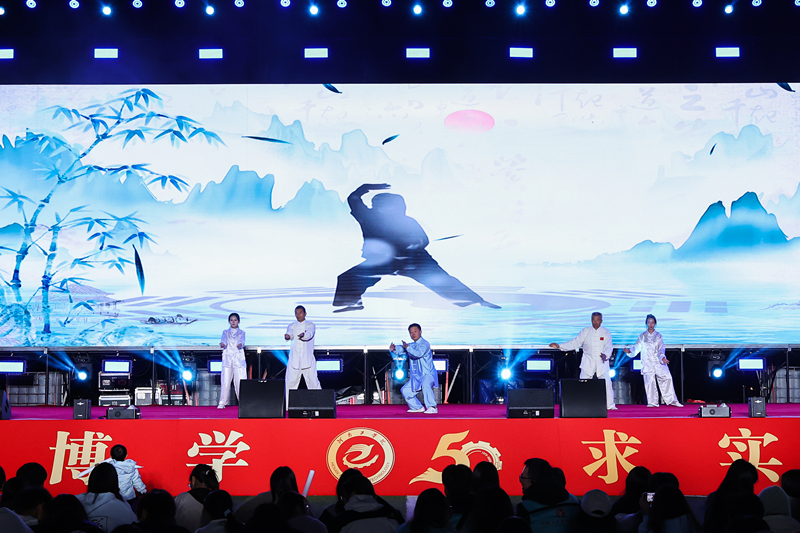 “启航”篇章里,精彩的民乐和舞蹈演出,赢得现场观众的阵阵欢呼和热烈掌声,三句半表演《河工华诞五十年,再谱新篇看明天!》将传统艺术与学校办学成果巧妙结合,幽默的表演让现场笑声不断。校党委副书记路阳领演的《健康赢未来》刚柔并济,将传统武术与现代舞蹈完美融合,展现了新一代河工人昂扬向上的精神风貌;一曲《远走高飞》激情洋溢,充满动感与活力,校党委副书记、副校长梁静即兴致辞,祝愿每一位河工人前程锦绣,将现场气氛推向顶点。最后,晚会在校歌大合唱《开拓之歌》中落下帷幕,熟悉的旋律引发不同年龄层师生的强烈共鸣,台上台下放声高歌,全体演职人员与现场观众共同起立,挥舞着手中的荧光棒,歌声响彻夜空。