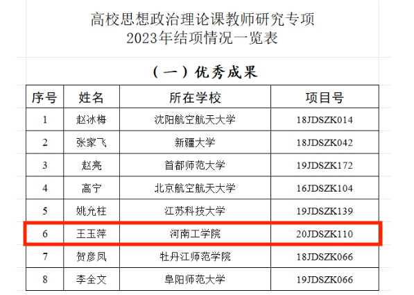 据悉,本次申请结项项目经专家评审,教育部社科司审核后,共评出优秀成果8项,合格成果81项。王玉萍主持完成的项目是河南省唯一获评优秀成果的项目。