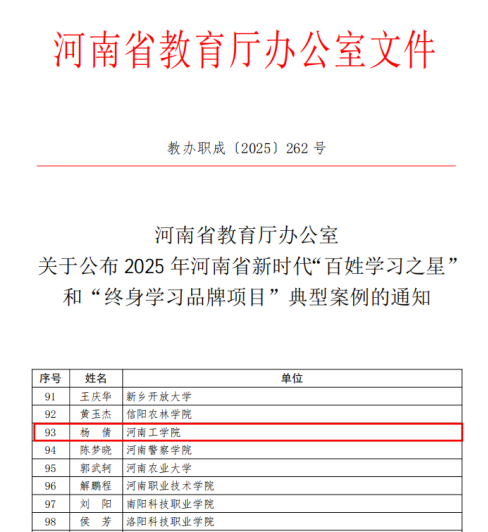 近日,省教育厅2025年河南省新时代“百姓学习之星”和“终身学习品牌”典型案例推介活动结果揭晓,我校马克思主义学院教师杨倩荣获2025年河南省新时代“百姓学习之星”称号。