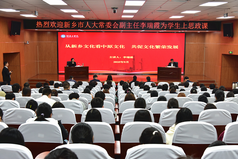 李瑞霞结合新乡深厚的历史文化底蕴,从新乡市史略及基本概况、文旅资源、人文概况等三个维度开讲,以新乡的名人、《诗经》在新乡为切入点,生动阐释了新乡作为中原文化重要发祥地的历史地位,并进一步延伸到中原文化“兼容并蓄、刚健有为”的精神内核。李瑞霞用翔实的史料和鲜活的案例,从新乡文化透视中原文明,既看到望京楼的建筑智慧、河南村治学院的救国探索,也触摸到《诗经》浸润的诗意根脉,更见证姜太公、比干等先贤铸就的精神丰碑。她勉励在场学生,既要深耕脚下这片文化沃土,更要胸怀“国之大者”,将个人成长融入国家文化软实力提升的宏大叙事中。她希望学校继续发挥思政教育主阵地作用,推动地方文化资源与教育教学深度融合,培育更多具有家国情怀和文化视野的时代新人。